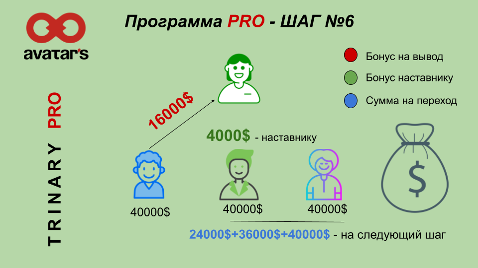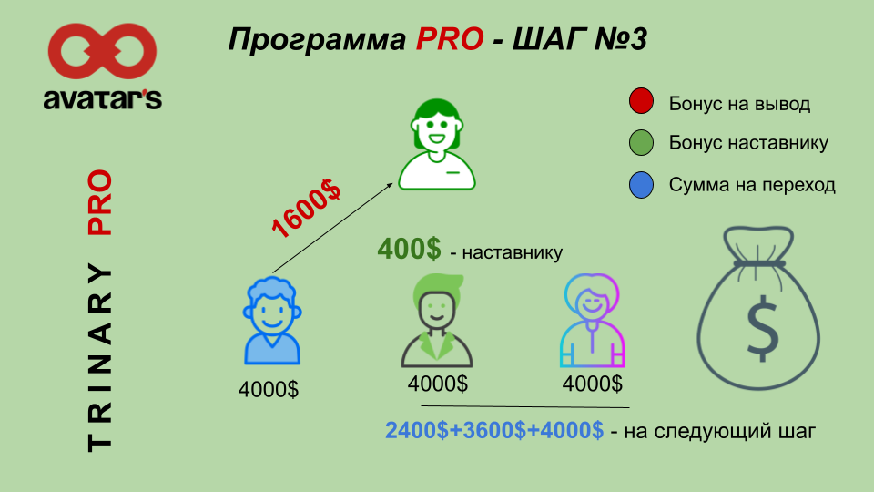 • Со 2-го — бонус Наставнику - $40, а $360 + $400 от 3-го дает переход следующий шаг.
