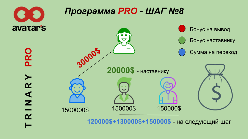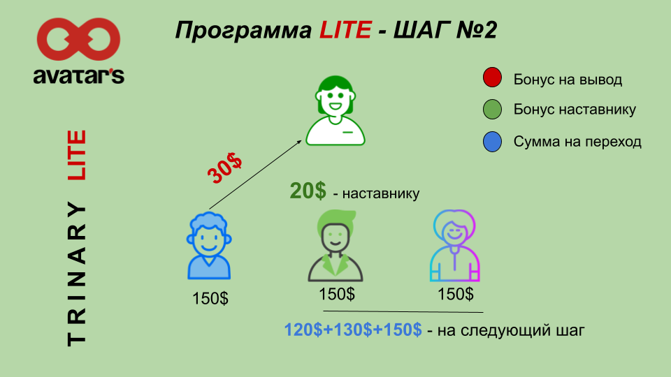 • Со 2-го — бонус Наставнику составит $20, а $130+$150 от 3-его дает переход на следующий шаг.