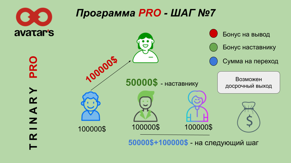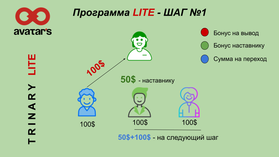 • Со 2го — бонус Наставнику составит $50, а $50+$100 от 3-его дает переход на следующий шаг.