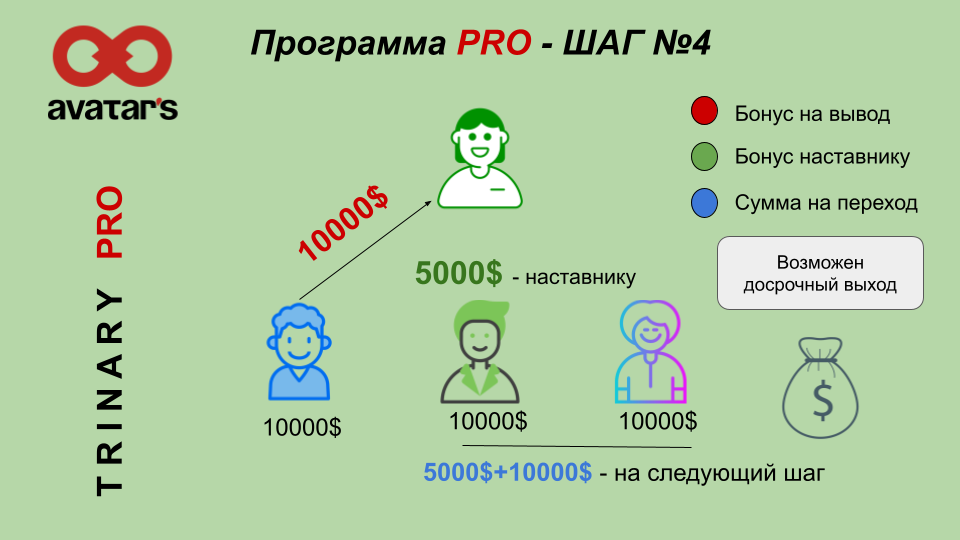 Выплата - 10000$ Рефбонус - 5000$ Досрочный выход - 10000$ за 3-го